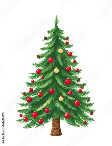 Christmas tree decorated with red and gold ornaments. Traditional New year design element. Vector illustration isolated on white background