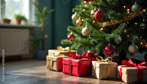 Christmas tree decorated with wrapped gifts, bows, and ornaments , holiday decor, joy, ornaments