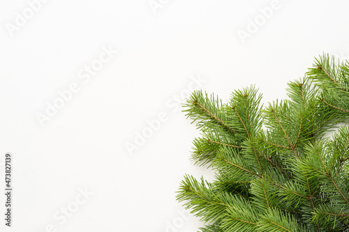 Christmas tree green branches on a white background. Decorations for Christmas and New Year. Top view