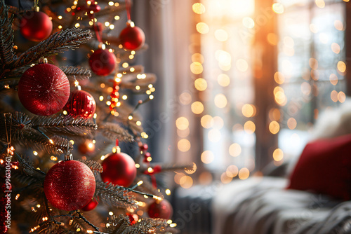 Christmas tree in interior with defocused lights. Christmas abstract blur background. Out of focus holiday background. Light bokeh from Xmas tree. Festive backdrop for Xmas and New Year theme