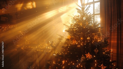 christmas, tree, holiday, festive, decoration, light, ornament, indoor, sunlight, ray, gold, cosy, home, winter, celebration, glowing, warm, seasonal, traditional, family, december, spruce, silhouette, glimmer, sparkle, magic, star, spirit, merry, new year, festive season, joy, happiness, residential, christmas eve, ambience, peaceful, decorative, curtain, window, interior, shining, bright, aethereal, tranquil, serenity, golden light