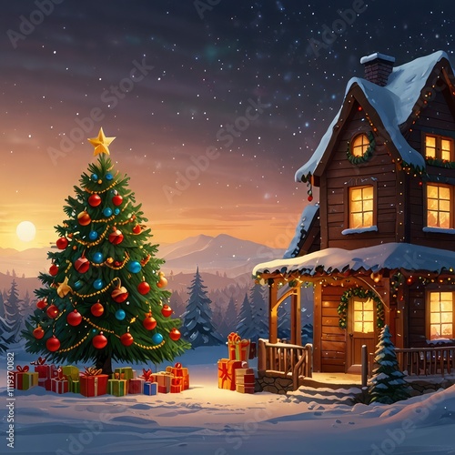 christmas, tree, winter, snow, holiday, christmas tree, christmas, decoration, illustration, celebration, house, vector, season, landscape, star, new year, gift, snowflake, year, fir, new, card, greeting, december, cartoon