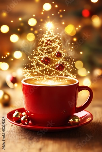 christmas, hot drink, tree, glistering, holiday, red, cup, drink, beverage, hot, steam, winter, celebration, festive, warm, cosy, magic, cafes, cappuccino, latte, aroma, season, december, bokeh, light, background, wood, table, decoration, ornament, gold, brown, christmas, mug, espresso, delicious, vertical