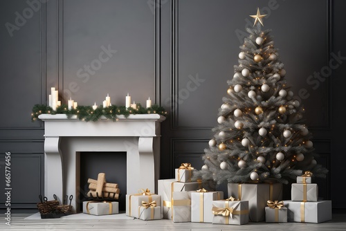 Christmas Tree Surrounded By Presents Against The Charming Backdrop Of Fireplace