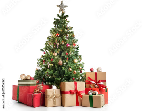 Christmas tree with Christmas ornaments and Christmas gifts beside it. isolated on white background