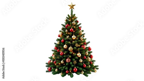 Christmas tree with decoration of lights and bulbs and star, isolated on white background