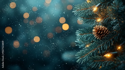 Christmas tree with fir cones and beautyful lights bokeh background. Space for text. Copy space. Greeting card.