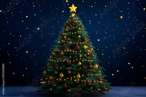 christmas, tree, holiday, winter, star, decoration, christmas, christmas tree, celebration, snow, illustration, vector, card, new year, season, year, new, design, fir, snowflake, night, pine, ornament, green, merry