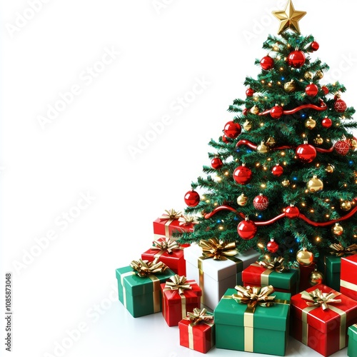 christmas, tree, christmas, holiday, present, gift, winter, festive, celebration, decoration, ornament, red, green, gold, ribbon, bow, background, white, isolated, studio, digital, illustration, holiday season, christmas tree, christmas gift, christmas decoration, christmas background, new year, happy new year, seasons greetings, merry