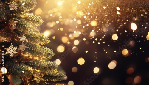 Christmas tree with snowflakes and lights in the background