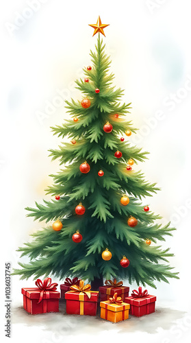 christmas, watercolor, tree, gift, box, present, festive, holiday, design, generated, artificial, intelligence, technology, today, decoration, christmas tree, christmas, fir, celebration, ball, star, winter, pine, new, year, season, green, isolated, ornament, illustration, present, new year, december, colours, vector