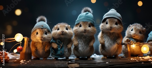 Christmas winter landscape with snow drifts, mountain village, deer, forest, pines, reindeer. Holiday nature background with fox, hills, houses.