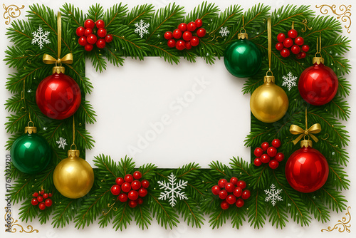 Christmas wreath border with red green and gold baubles and pine branches festive holiday background frame