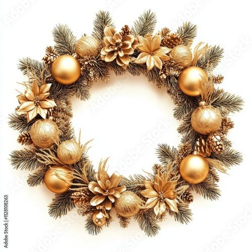 Christmas wreath with golden ornaments and decorations, isolated on a white background.