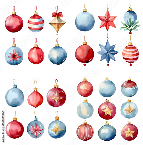 Christmas-red color themed watercolor cute clipart hand drawing, Christmas Ornaments – Various shapes like balls, stars, or bells