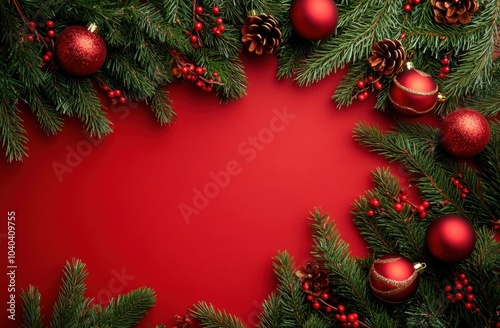 Christmas-themed red background with Christmas decorations, a border frame with Christmas tree branches and ornaments Generative AI