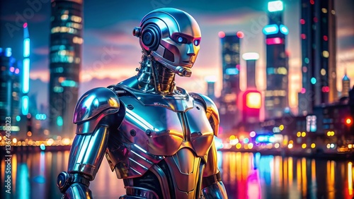 Chrome Robot Night Cityscape Profile View - Futuristic Sci-Fi Stock Photo