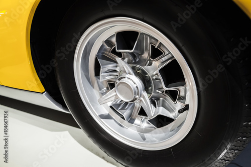 wheel, retro, car, vintage, old, old-timer, fragment, chrome, italian, luxury, shiny, black, classic, nobody, technology, object, auto, automotive, chromed, disc, vehicle, cap, automobile, design, metal, steel, transportation, drive, tire, shape, detail, sport, style, transport, equipment, metallic, closeup, alloy, sport, yellow