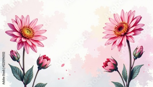 Chrysanthemum blooms in shades of pink and white, elegant, flowers, watercolor