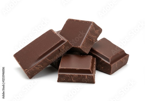 Chunks of dark chocolate with sharp edges and a matte finish arranged in a small pile isolated on white background