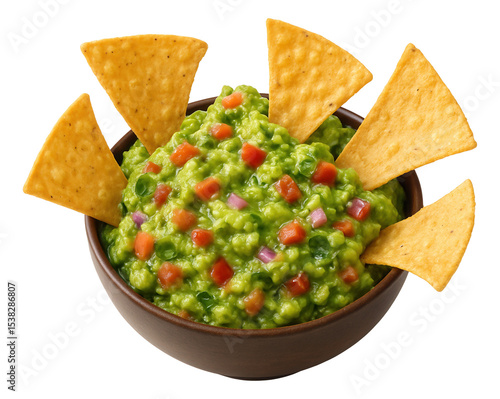 Chunky guacamole with diced tomatoes and onions in a bowl, surrounded by tortilla chips.