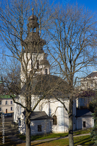 temple, church, aged, city, white, tree, house, square, travel, poland, unesco, europa, history, heritage, exterior, historic, renaissance, blue skies, renaissance, architecture, autumn, tree, tower, bell tower
