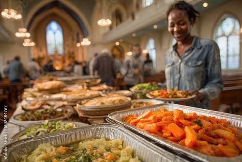 Church feast features a smiling woman serving buffet food indoors. Great image to promote faith-based events, giving and community.