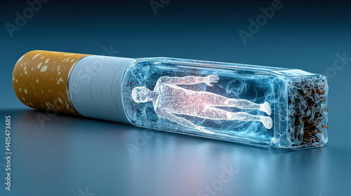 cigarette shaped like coffin with fading human figure inside symbolizes dangers of smoking and its impact on health. image conveys powerful message