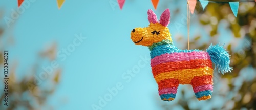 Cinco de Mayo concept. Colorful piñata hanging outdoors with festive decorations in a bright blue sky.