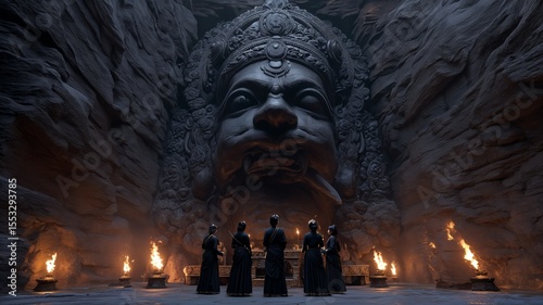 shrine, beast, rock, carved, hooded, ritual, dark, fire, mystery, old, civilisation, deity, shadow, reverence, underground, monumental