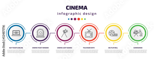 cinema infographic template with icons and 6 step or option. cinema icons such as buy tickets online, cinema ticket window, light source, television with antenna, big film roll, cameraman vector.