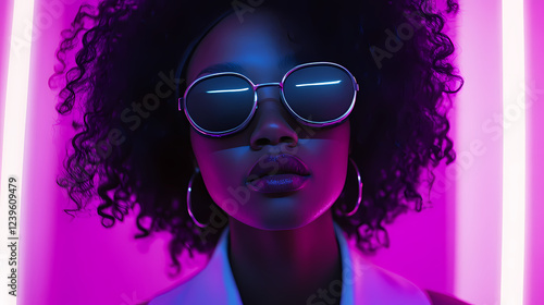 cinematic, black, woman, wearing, headset, white, room, neon, light, curly, hair, framing, face, minimalistic, design, fashion, photo, warm, illustration