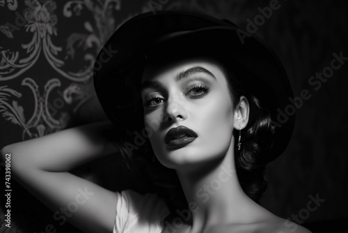 fashion, glamour, brunette, cinematic, closeup, make-up, woman, model, portrait, monochrome, black, white, black-and-white, modern, fashionable, beauty, lip, make-up, hair, eye, skin, style, coiffure, person, lady, sensuality, red, face, studio, sensual, hat, people, dark, 1, closeup, looking, retro, teenage