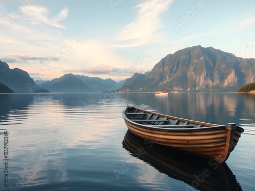 Cinematic Photo of a Wooden Rowboat on a Calm Norwegian Fjord in Early Summer. A small wooden rowing boat moored on a beautiful and very calm Norwegian fjord on a beautiful early summer day. cinematic