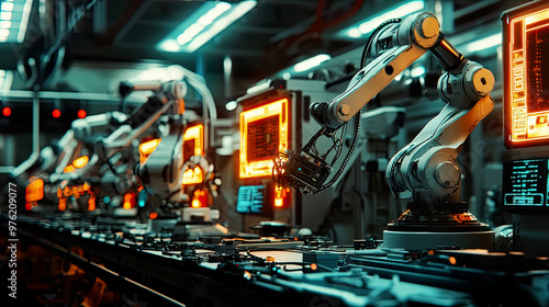 Cinematic shot of robots working on a high-tech assembly line, glowing control panels, sharp lighting