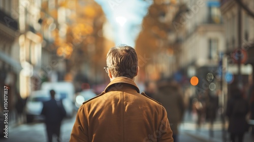 Cinematic shot of the back view from behind an elegant man in his thirties with short hair and glasses, wearing a brown jacket, walking on the street of Paris on a sunny day Generative AI