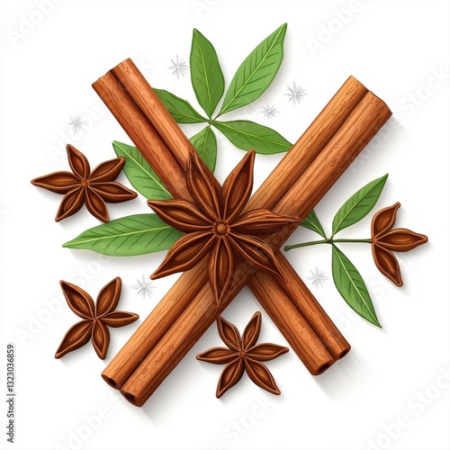cinnamon, star anise, spice, herb, leaf, aromatic, flavouring, culinary, cooking, baking, ingredient, food, receipe, brown, green, white background, illustration, graphic, design, still life, topview, closeup, texture, organic, natural, healthy, delicious, warm, spicey, sweet, winter, holiday, christmas, new year, autumn, fall, seasoning, condiment, fragrance, aroma, fresh, vibrant, composition, arrangement, image, photo, photo