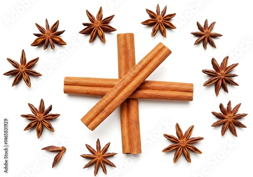 Cinnamon sticks crossed with star anise arranged in a circle on a clean white background top down view