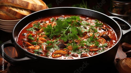 Cioppino seafood stew with shrimp and mussels in bowl.