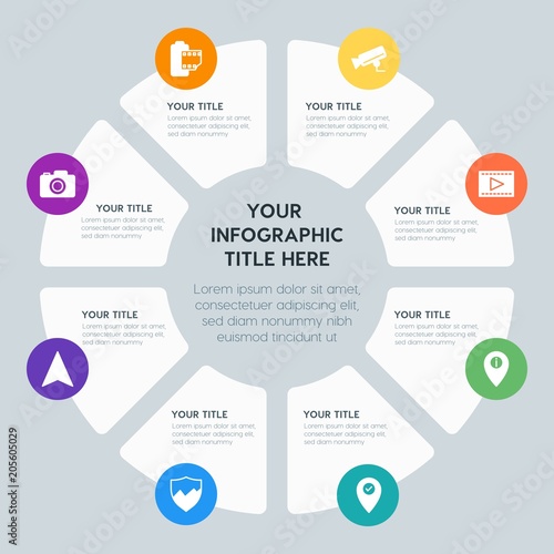 Circle chart location, security, video, photos infographic template with 8 options for presentations, advertising, annual reports