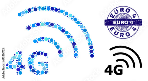 Circle combination 4G internet icon and EURO 4 round dirty stamp seal. Blue stamp includes EURO 4 caption inside circle and guilloche structure. Vector collage is based on 4G internet symbol,