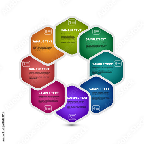 Circle infographic template with 8 steps. Corolful hexagons with sample text. For presentation and design concept. Vector illustration.