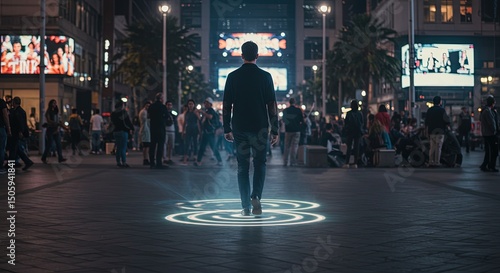 man, urban, square, night, glowing, ring, light, pavement, dark, suit, back, turned, crowd, motion, blur, isolation, digital, billboard, bright, light, advertisement, towering, building, city, life, neon, futuristic, ambience, contrast, solitude, vibrant, scene, modern, tech, age, introspection