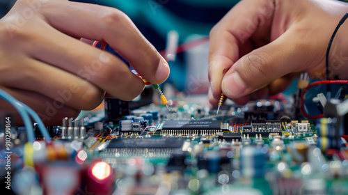 circuit board, hand, wire, component, electronic, technology, repair, engineering, soldering, assembly, bricolage, hobby, work, closeup, macro, detail, sharpened, blurry, background, soldering iron