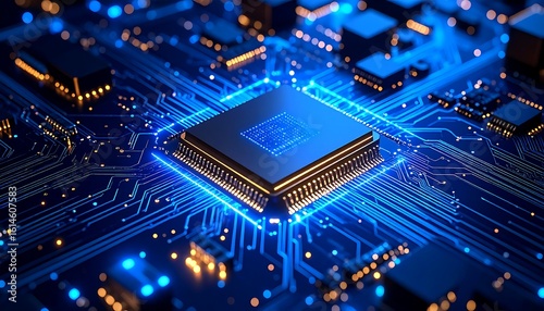 circuit, processor, board, technology, electronic, blue, gold, component, detail, modern, tech, digital, future, innovation, computer, advanced, dark, light, line, connection, glow, square