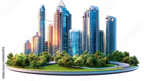 city landscape, urban, building, skyscraper, modern, architecture, tree, urban scene, modern architecture, city, green, road, circular, isolated