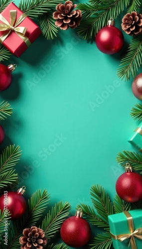 Circular frame of pine, gifts, baubles on teal Top view , boxes, red, circle