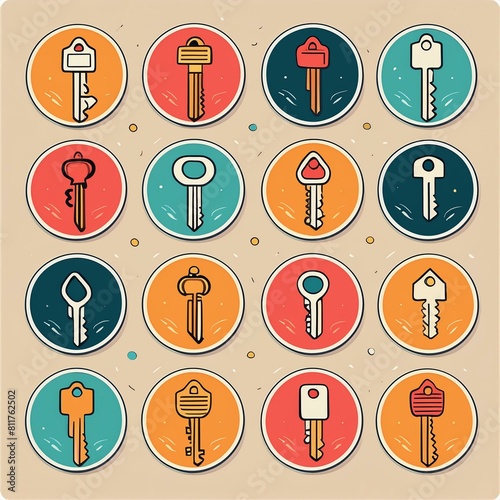 Circular Key Stickers featuring illustrations of vintage-style keys with intricate designs