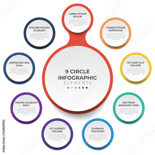 Circular layout diagram with 9 points of steps, sequence, colorful circle infographic element template vector.