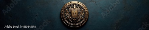 Circular metal badge with intricate pin design on a dark background, isolated, circular, pin